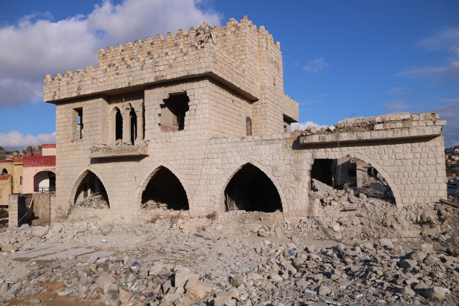 "I returned to my village on November 28. I thought I was ready, that I had prepared my heart for the destruction and come to terms with the idea of loss, but nothing prepares you to see your childhood memories destroyed, and no one teaches you how to walk over rubble without breaking down. Every stone knew me, every tree remembered my voice. And now, everything looks at me as if asking: Where were you? When I arrived at the Martyrs' Garden, I couldn't find it. The blue dome that had always fluttered above the names of loved ones was lying on the ground, cracked like my heart. I jumped over it to be the first to enter. I couldn't control myself; I ran like someone searching for their soul among the rubble. I expected to find a single witness, a name engraved, something to reassure me that the memory was still alive, but there was no trace of the graves. It was as if the earth had swallowed up those inside, as if the war wanted to erase even the idea of immortality. I was very sad, not only because the graves had been destroyed, but because those who destroyed them thought they had killed the memory. What was even harder than all that was the moment when the bulldozers came, clearing away the rubble as if they were clearing away our past. The sound of metal on stone was like a faint scream that no one could hear. I resisted the urge to scream, but I remained silent, staring and crying inside. Abdullah Khanafer, a young man in his twenties from Aynatha, sent me this text, which he had kept on his phone since November 28, 2024, after I asked him about his memory of that day because I was unable to be there as a witness at the time.